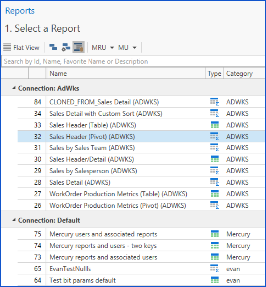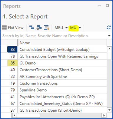 Sorts the report list on the basis of the most recently used by the current user (displays the most recent report at the top of the list). On just clicking the drop-down arrow next to MRU itself, you'll see a picklist. Selecting an item from the list will take you to the corresponding report in the main reports grid. | |